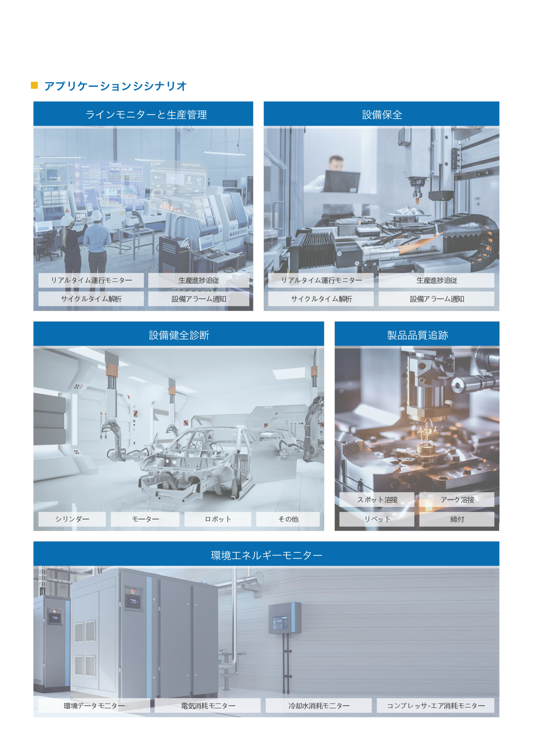 生産ライン、設備の運用、機械の監視データなどを統合し、生産ラインを可視化します。 わかりやすく直感的な生産ラインの管理を実現します。