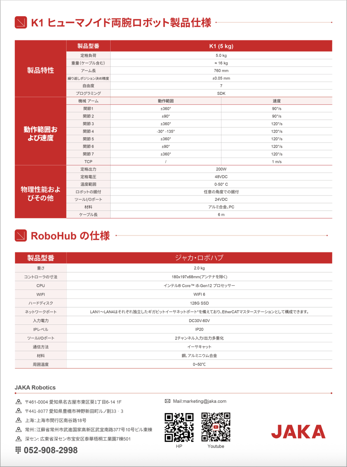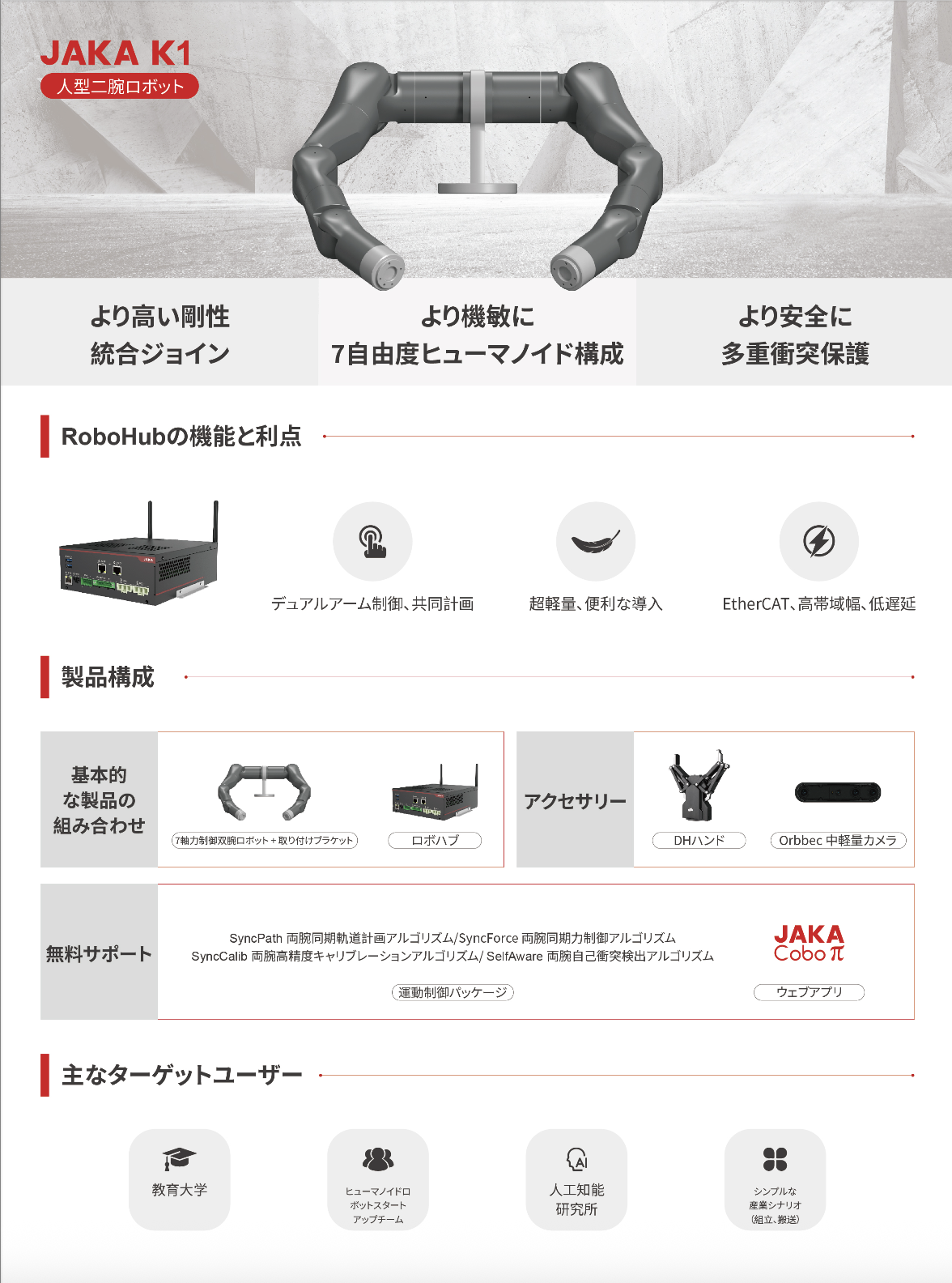 ホーム / 取扱製品 / 国内販売製品 / JAKA K1 JAKA K1 人型二腕口ポット 製品の特長・特性 デュアルアーム制御、共同計画 超軽量、便利な導入 EtherCAT、高帯域幅、低遅延 資料のダウンロードはこちら JAKA K1 製品パンフレット・仕様のダウンロードはこちら 国内販売製品一覧に戻る