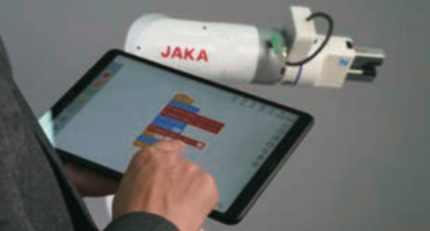 スクラッチ方式で初心者でもすぐに操作可能。ロボット動作の教示は JAKA APPを通して。